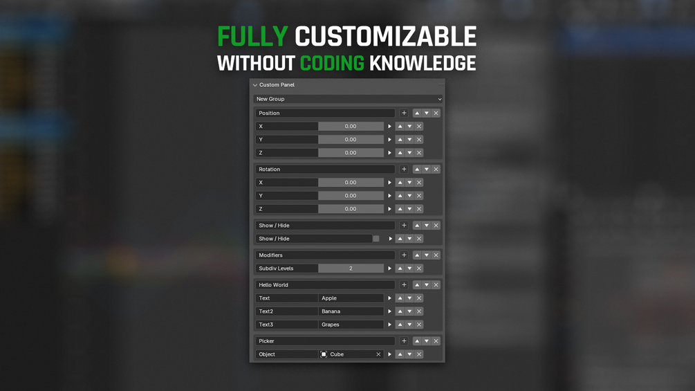 Create a custom UI panel and drive any value you choose, with the ability to add Float, Integer, Boolean, String, and Object Pickers in multiple groups. And it's all re-orderable and re-nameable!